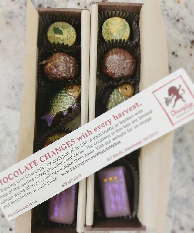 Gift September 6, 2018September 25, 2018What's In My Box Small Bonbon Sharing Boxes. The purple striped bonbon is Silken Covers–silk road spice caramel enrobed in dark chocolate, and the green coin at the top is a Jalapeno Lime Liquid Caramel in Itakuja Brazilian dark chocolate.