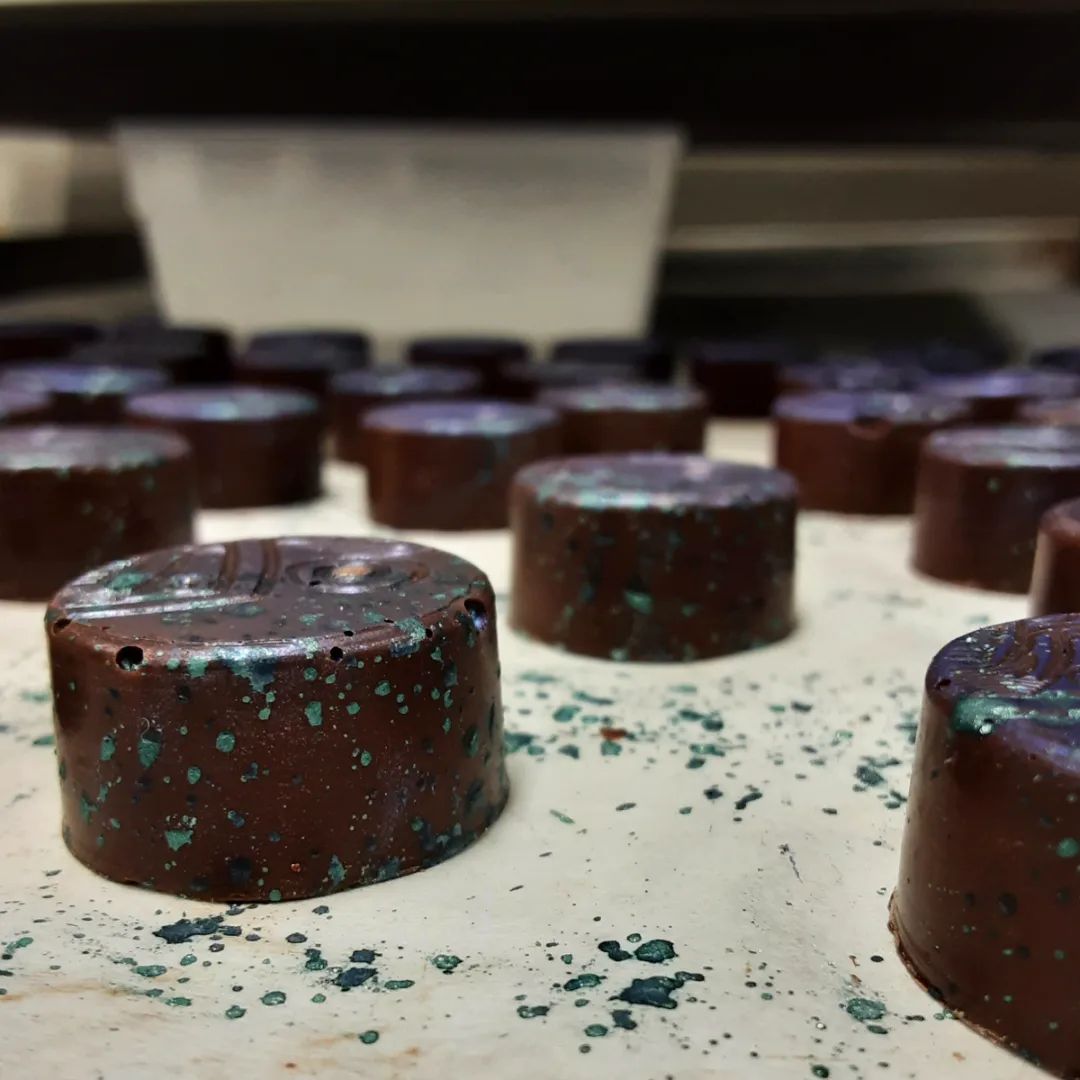 SOMETHING ABOUT SPLATTERS: housemade mexico dark milk shell around a chile marshmallow