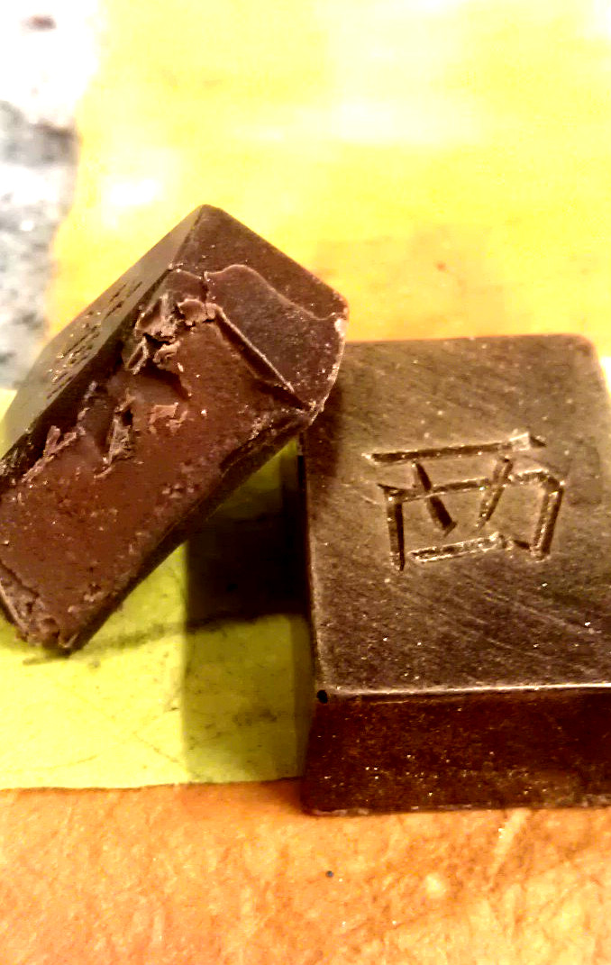 A tile of banana maple ganache in Peruvian Piura 67% dark chocolate.