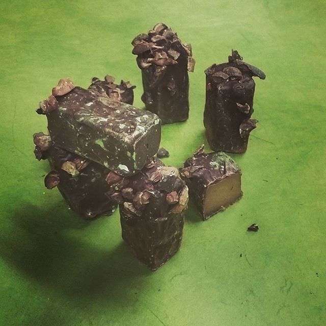 STONEHENGE – chewy local rhubarb caramel in Liona Dominican Republic dark chocolate finished with Ecuador cacao nibs.