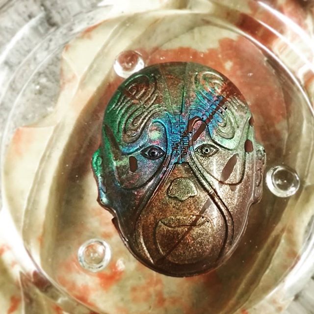 Colorful Mask August 16, 2017August 16, 2017What's In My Box SWEET SIGHTS UNSEEN – cherry caramel in a Liona Hispaniola dark chocolate mask. Technically, the filling is a blend of housemade cherry-vanilla gummies and caramel. Cool texture and really tasty.