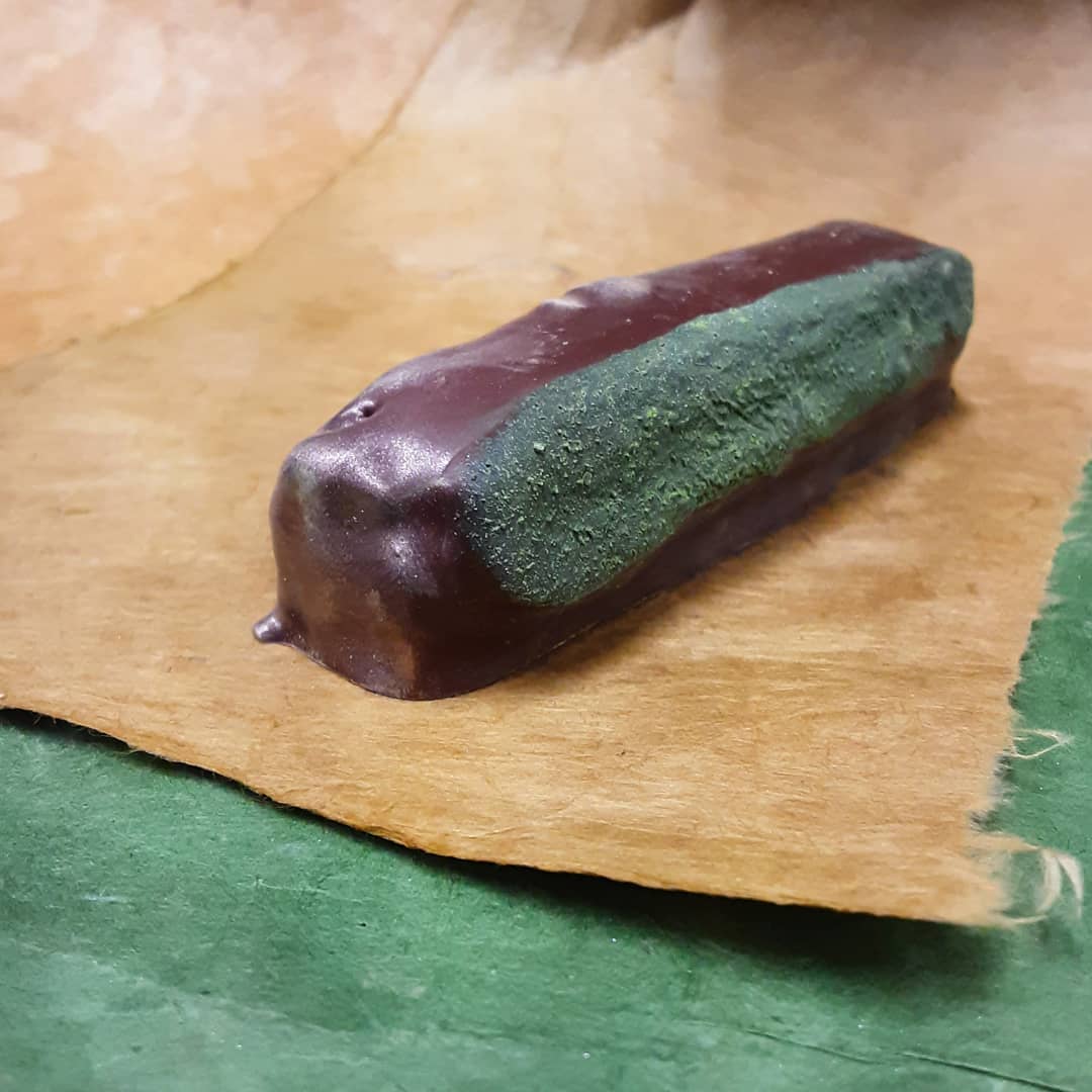Caramel, Nougat, Tea September 20, 2020September 21, 2020What's In My Box TEA GARDEN: a bit of nougat encompassing buttery caramel, wrapped in milky dark chocolate, softened (if only visually) with vibrant matcha. #chocolatier #teagarden #mossyrocks