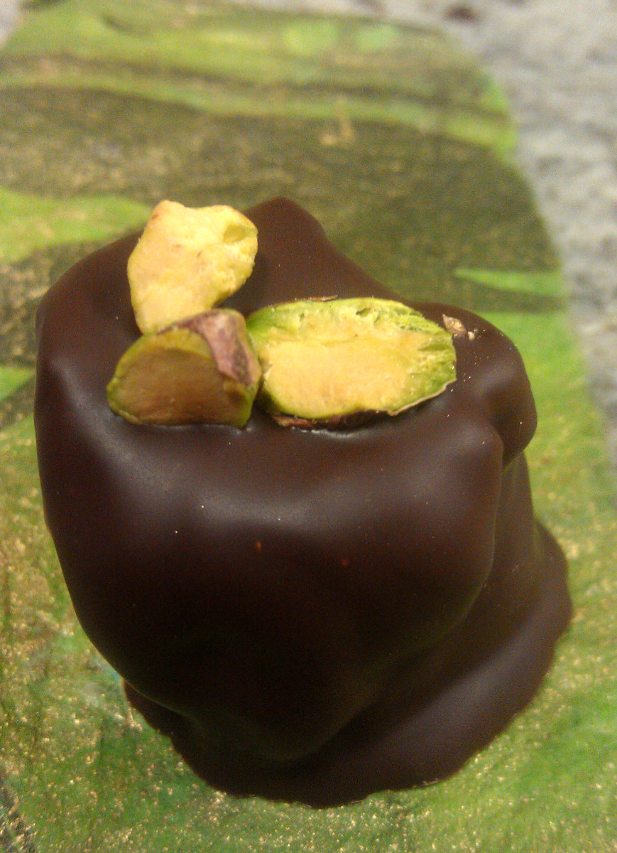 Imperial Sichuan Peppercorn caramel rolled with toasted pistachios and dipped in Axiom 60% dark chocolate.