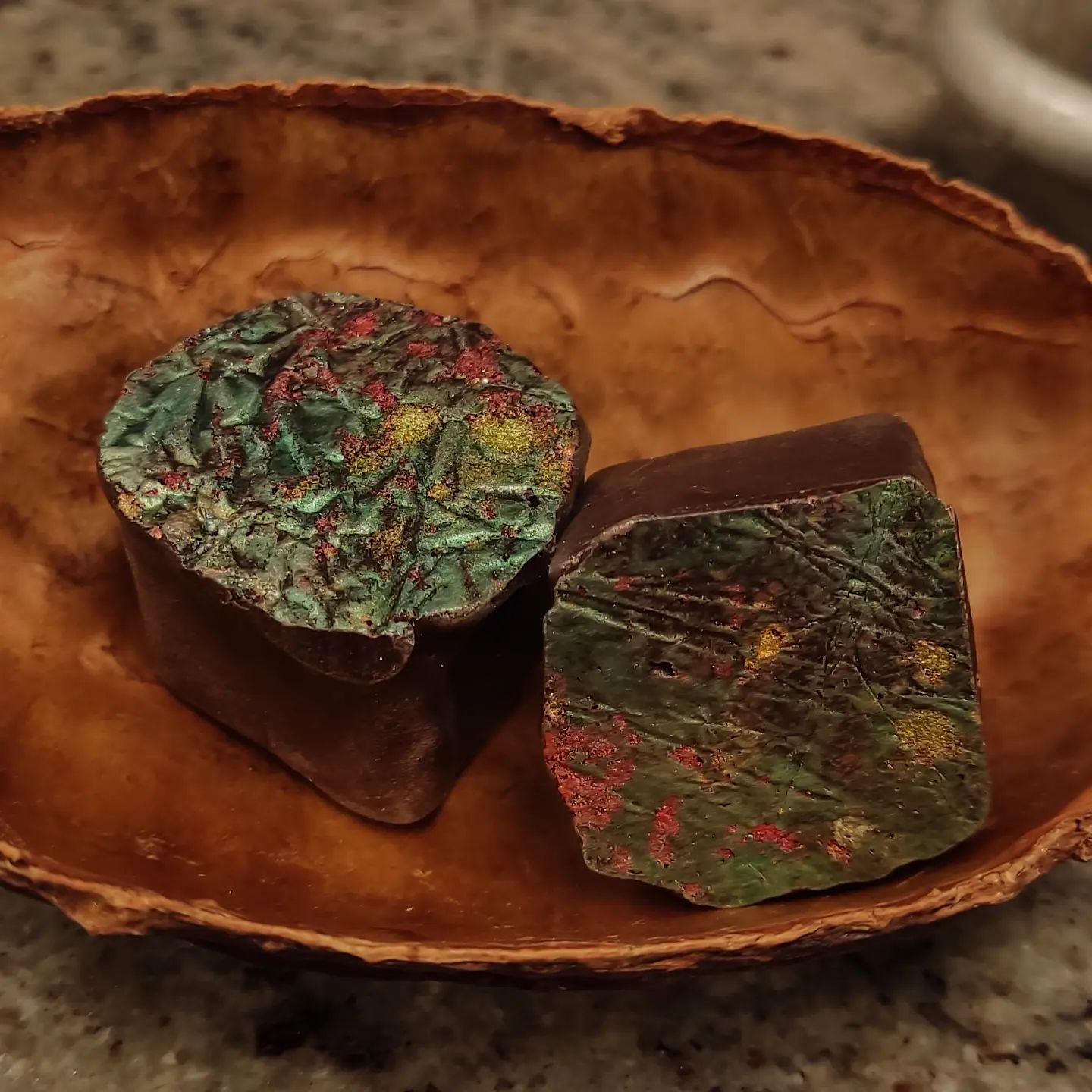 THE SOUND OF APRICOTS – basil ganache over apricot ganache dipped in earthy-fragrant Ecuador dark chocolate.