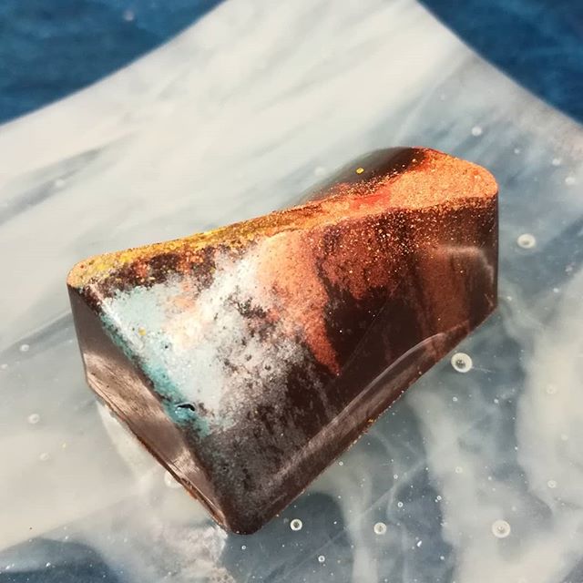 Chocolate & Caramel March 28, 2018March 28, 2018What's In My Box THE UNIVERSE IS AN ISLAND – Sumo citrus dust on Forteza Puerto Rican dark chocolate filled with butter caramel and Puerto Rican very dark chocolate ganache.