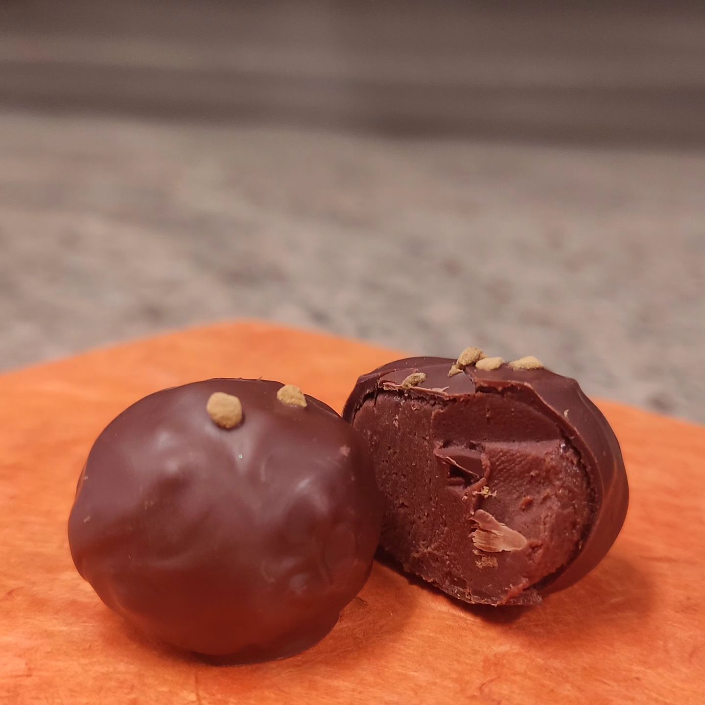THE USUAL – Tamarillos, DJ’s honey, and HCP #1 Heirloom Alto Beni dark chocolate ganache enrobed in HCP #2 Heirloom Tranquilidad dark. Both chocolates are wild-harvested Bolivia. We finished the truffle with local bee pollen.
