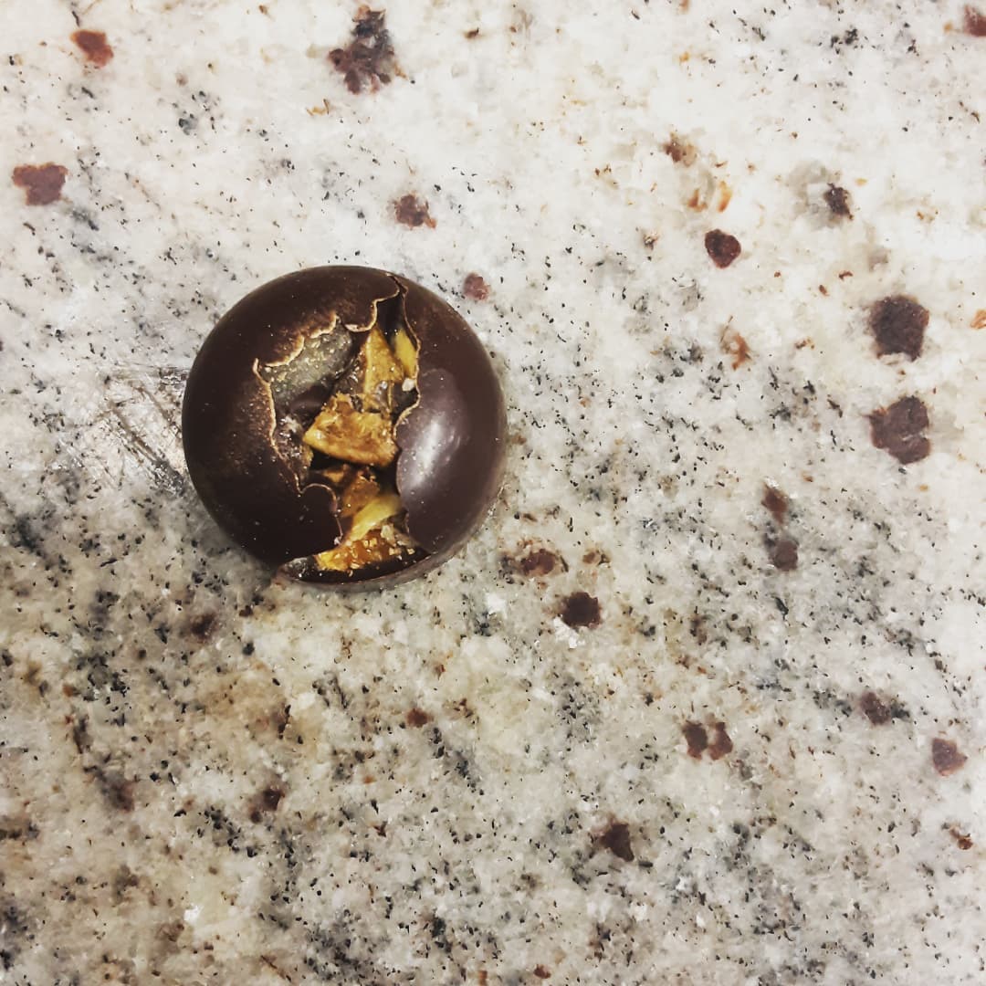 TOPICAL FRUIT SALAD – a cluster of candied and dried orange, pineapple, starfruit, and yuzu in Bolivian *Heirloom* dark chocolate.