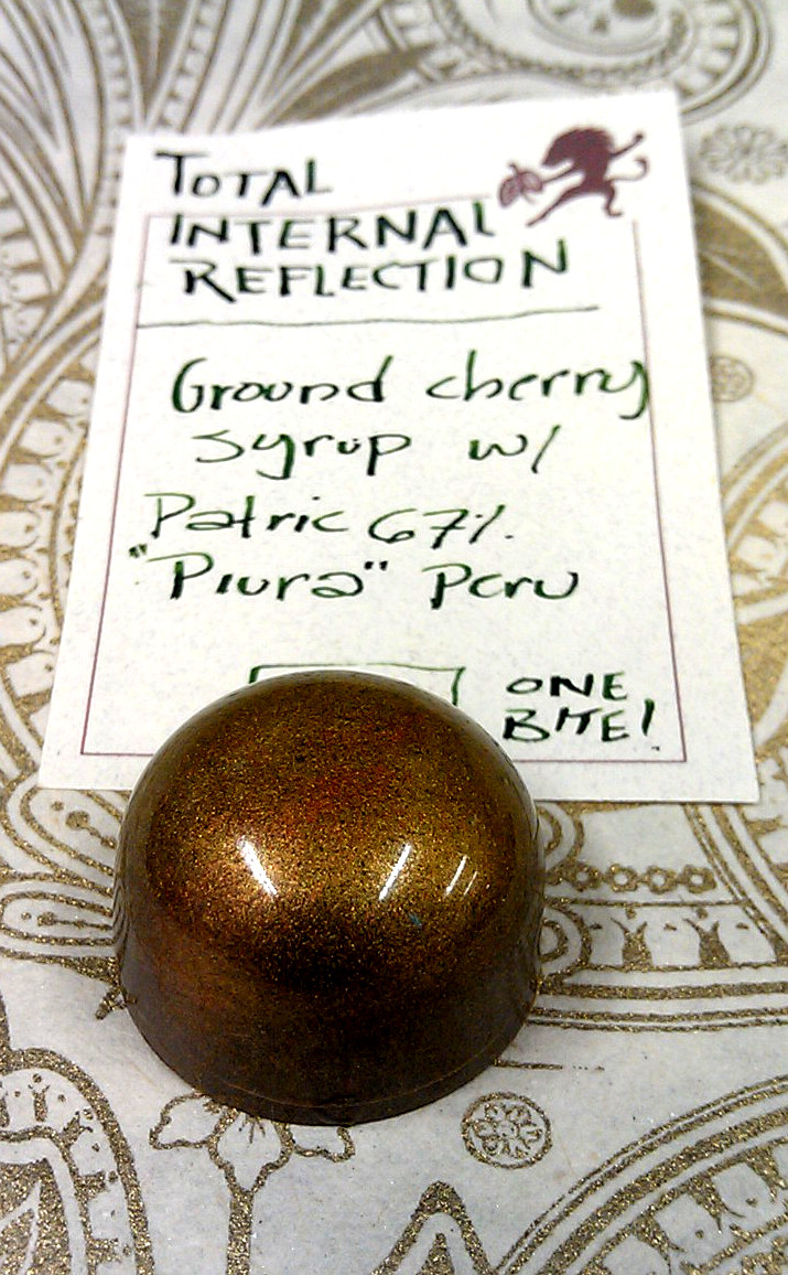 Total Internal Reflection (TIR) September 9, 2015March 30, 2016What's In My Box A liquid center of savory-sweet ground cherries in Peruvian “Piura Region” 67% dark chocolate. Price: 4.50 Number made: 60 Enjoy by: Oct 1, 2015 Ingredients: Fresh ground cherries, lemon, organic sugar, Patric 67% “Piura” Peruvian dark chocolate. See All Bonbons..