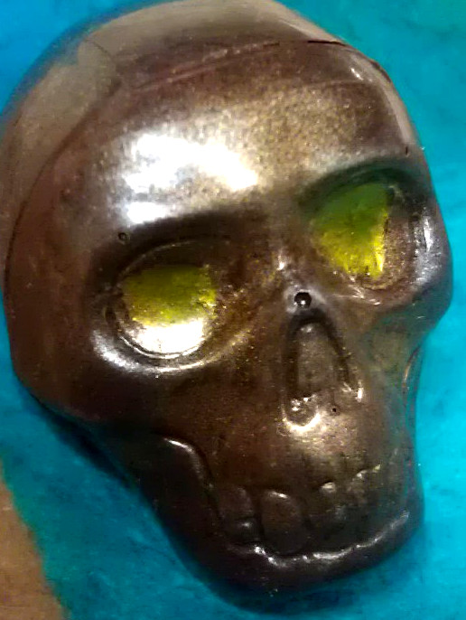A 3-dimensional skull half filled with habanero caramel and half filled with ghost chili ganache. Medium hot!