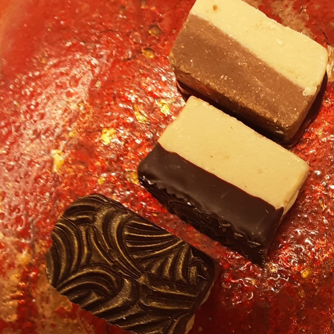 WHICH WAY UP? – Three layers of macadamia cremini (soft gianduja) dipped in Peru Ucayali River dark.:
