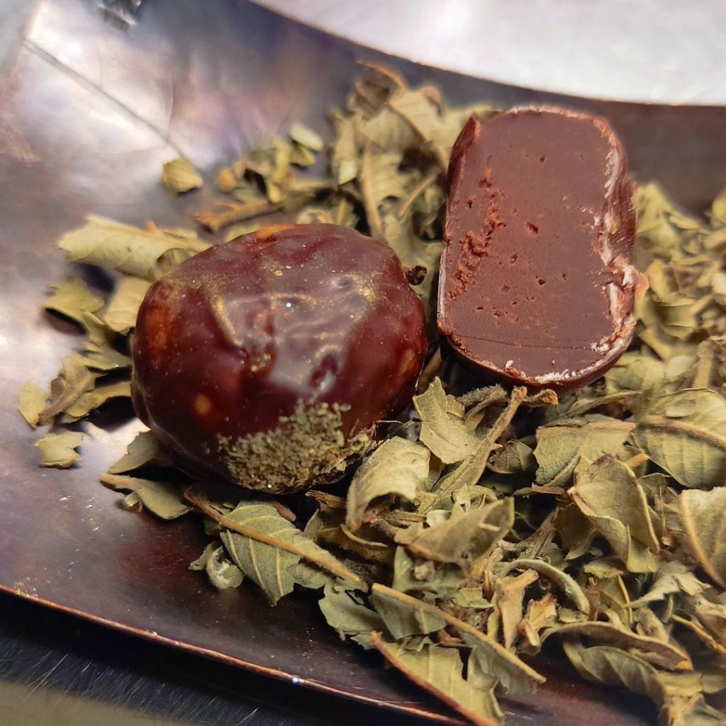 FAR FROM HERE – wild guava leaf with pineapple, tequila, and Buddha’s Hand citron in Mexico Chiapas dark chocolate, enrobed in a blend of Mexico “Almendra Blanca” and Ecuador chocolate and touched with powdered guava leaf.